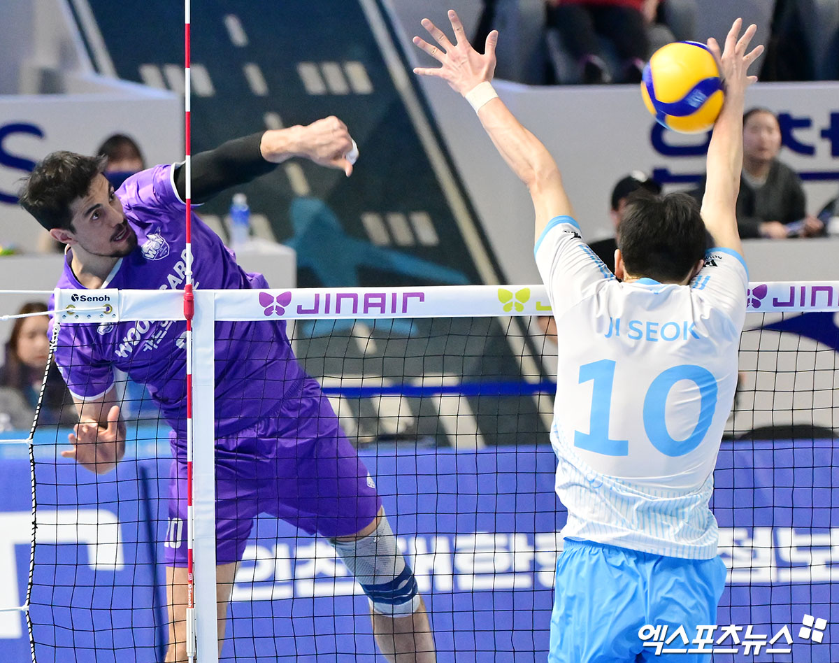 (엑스포츠뉴스 인천, 김한준 기자) 10일 오후 인천 계양체육관에서 열린 '진에어 2025-2026 V-리그' 대한항공과 우리카드의 경기, 우리카드 아라우조가 공격을 시도하고 있다.
