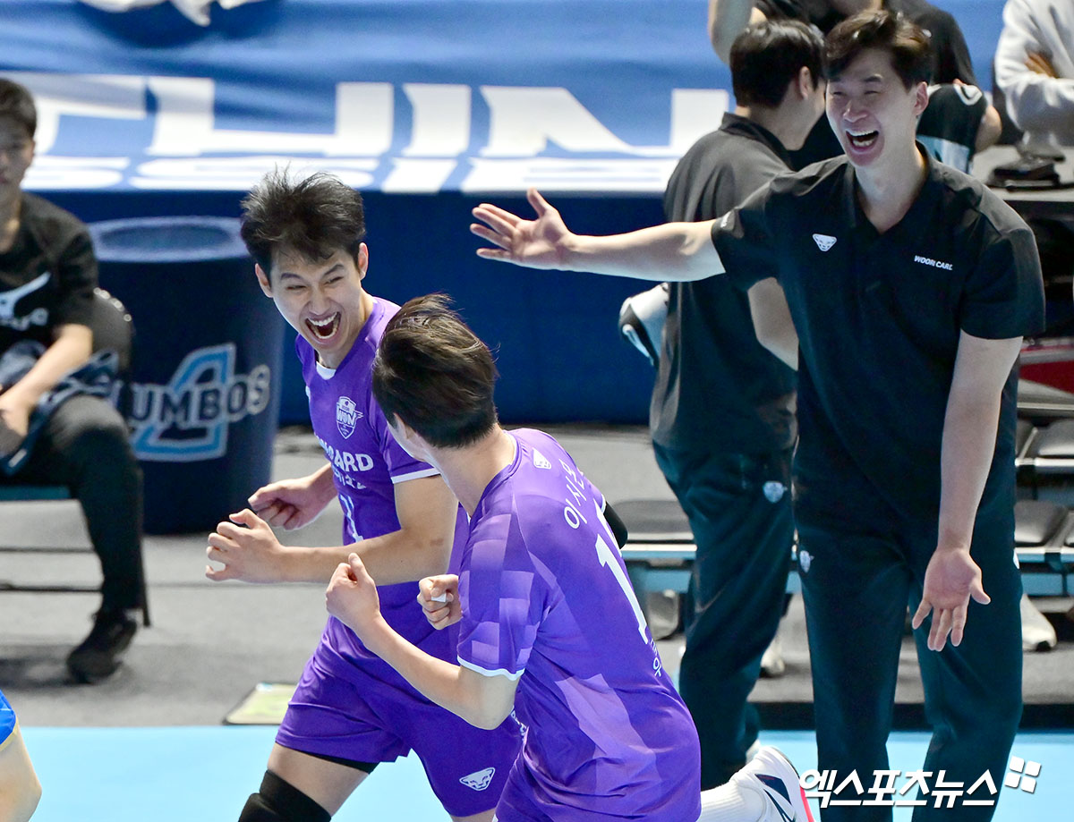 (엑스포츠뉴스 인천, 김한준 기자) 10일 오후 인천 계양체육관에서 열린 '진에어 2025-2026 V-리그' 대한항공과 우리카드의 경기, 우리카드 한성정이 득점 후 기뻐하고 있다.