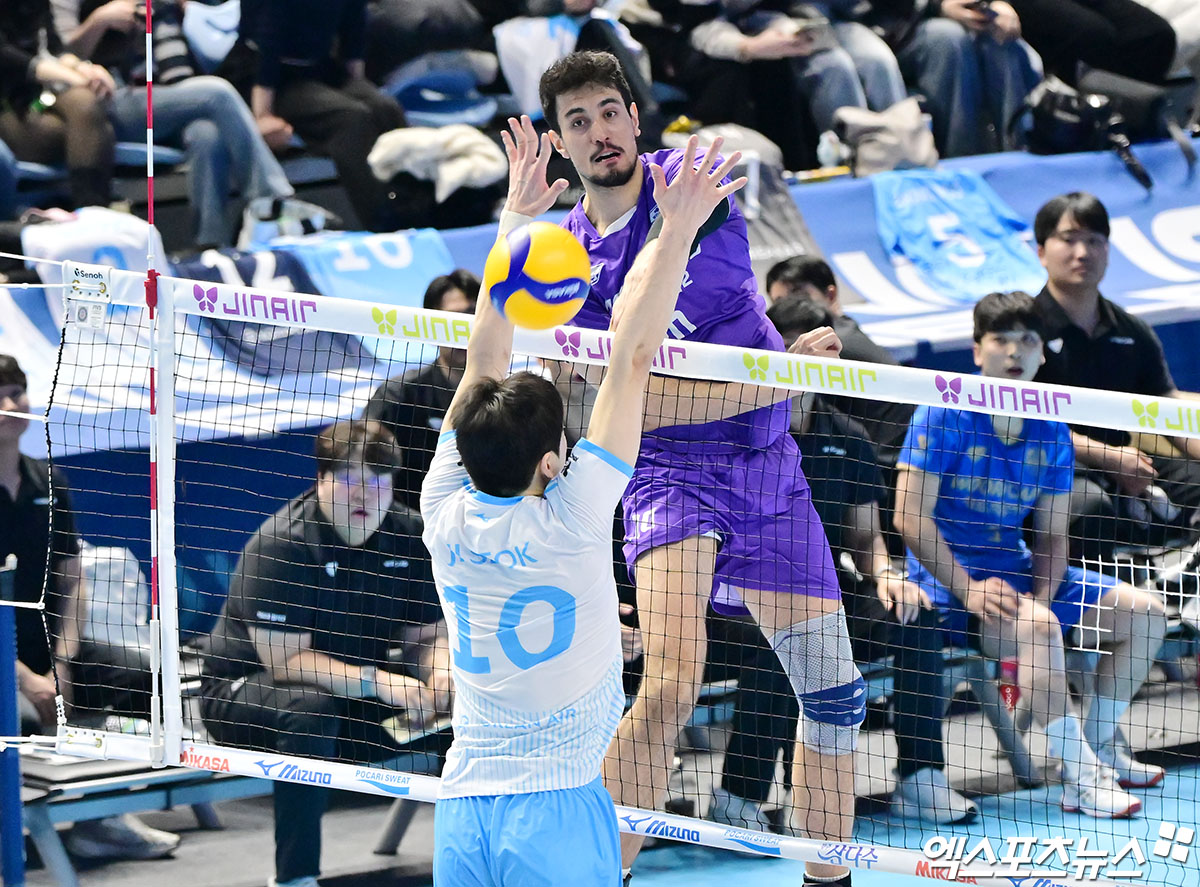 (엑스포츠뉴스 인천, 김한준 기자) 10일 오후 인천 계양체육관에서 열린 '진에어 2025-2026 V-리그' 대한항공과 우리카드의 경기, 우리카드 아라우조가 공격을 시도하고 있다.