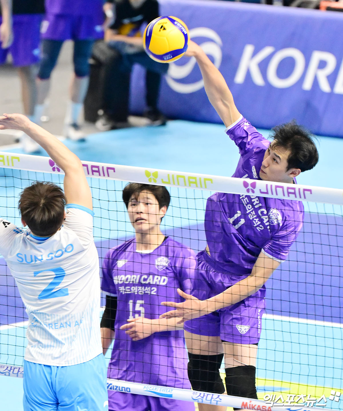 (엑스포츠뉴스 인천, 김한준 기자) 10일 오후 인천 계양체육관에서 열린 '진에어 2025-2026 V-리그' 대한항공과 우리카드의 경기, 우리카드 한성정이 공격을 시도하고 있다.
