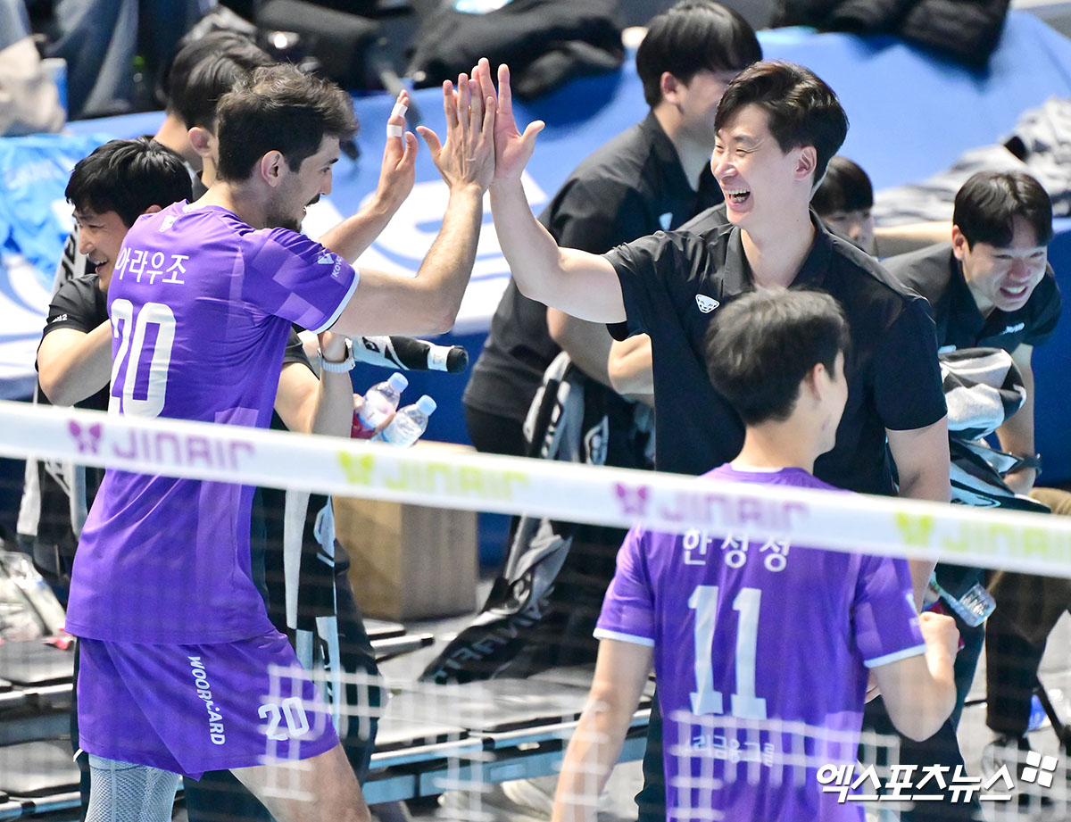 박철우 감독대행 ‘아라우조와 하이파이브’[포토]