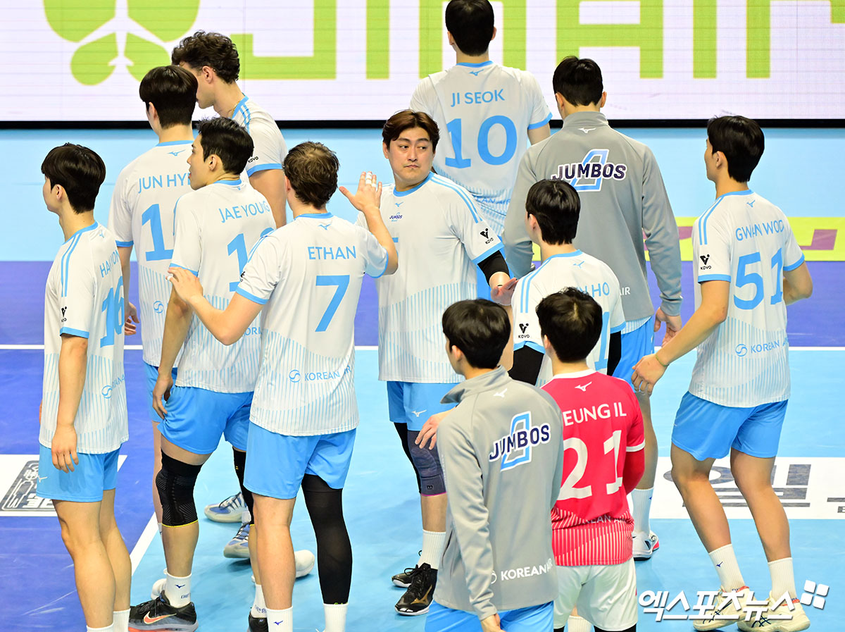 경기종료 후 대한항공 선수들이 아쉬워하고 있다.