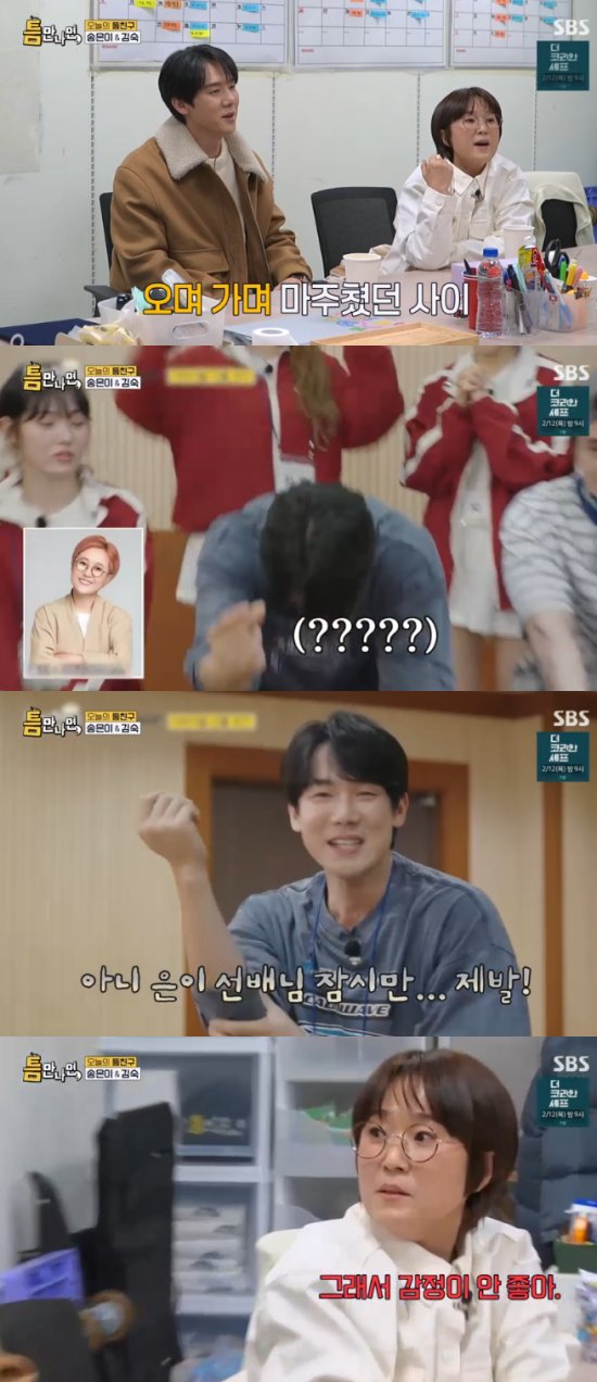 10일 방송된 SBS 예능 프로그램 '틈만 나면, 시즌4'에서는 '틈 친구'로 코미디언 송은이, 김숙이 출연해 유재석, 유연석과 함께 상암동을 찾아 '틈 주인'에게 행운을 선물했다.