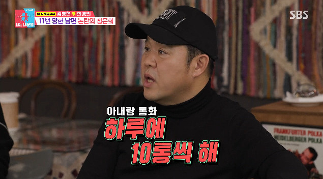 김구라는 "난 너하고 정반대다. 난 오늘도 아내한테 오기 전에 '병현이네 갔다 와' 하고 세 번 이야기했다"며 "아까 감기 기운이 살짝 있어서 병원 갔다 온 것도 얘기했다. 나는 와이프랑 전화를 하루에 열 통은 한다"고 '연쇄 통화범' 면모를 보였다.