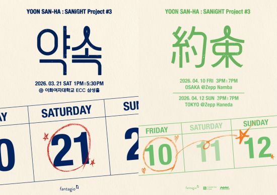 3년 연속 개최되는 윤산하의 소극장 콘서트 ‘YOON SAN-HA : SANiGHT Project #3 - 약속’의 한국 공연은 3월 21일 오후 1시, 5시 30분 2회에 걸쳐 서울 이화여자대학교 ECC 삼성홀에서 열린다. 티켓 오픈에 대한 정보는 추후 공식 SNS를 통해 공지될 예정이다.