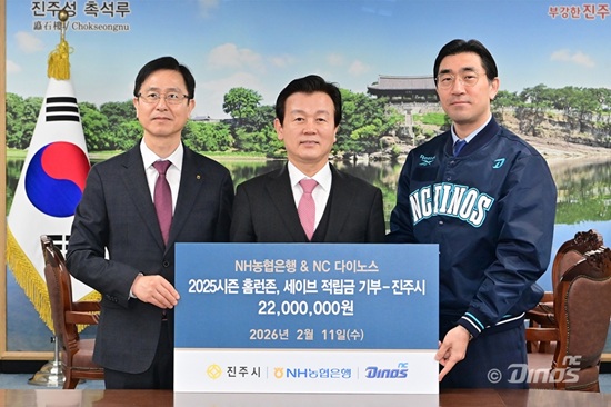 (엑스포츠뉴스 김유민 기자) NC 다이노스가 11일 진주시청에서 NH농협은행, 진주시와 함께 2025시즌 팀 기록과 연계해 조성한 기부금 전달식을 열었다.