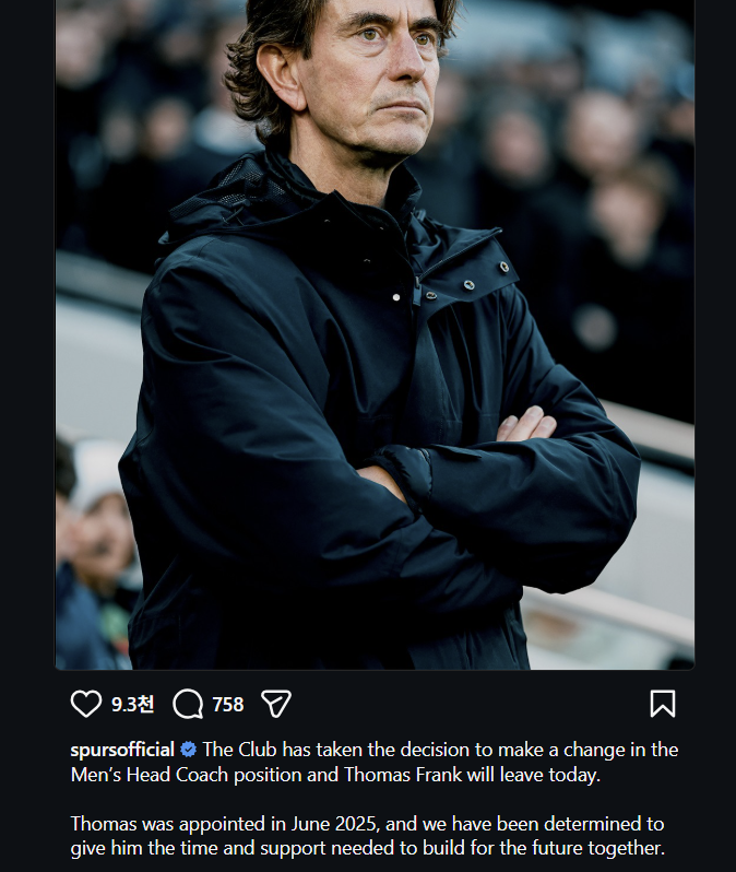 토트넘 구단은 11일 "구단은 남자팀 감독 교체를 결정했다. 토마스 프랭크 감독은 오늘 떠난다"고 밝혔다.