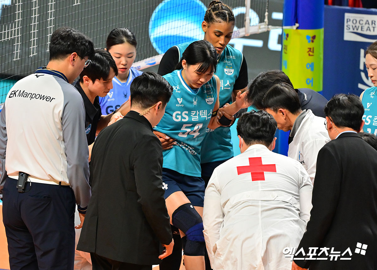 (엑스포츠뉴스 장충, 김한준 기자) 11일 오후 서울 장충체육관에서 열린 '진에어 2025-2026 V-리그' GS칼텍스와 페퍼저축은행의 경기, GS칼텍스 오세연이 부상을 당한 후 고통스러워하고 있다.