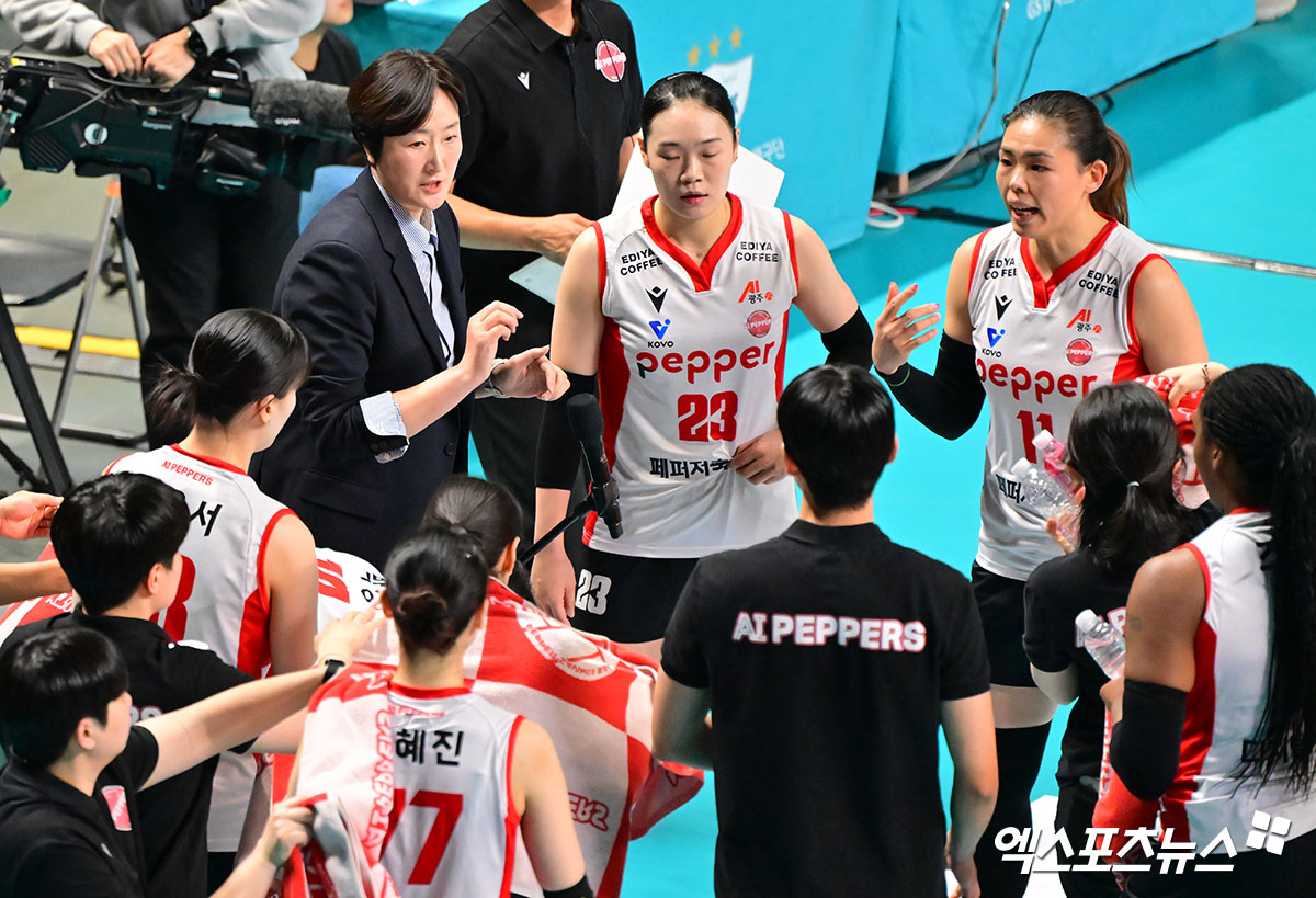 (엑스포츠뉴스 장충, 김한준 기자) 11일 오후 서울 장충체육관에서 열린 '진에어 2025-2026 V-리그' GS칼텍스와 페퍼저축은행의 경기, 페퍼저축은행 장소연 감독이 작전타임을 갖고 있다.