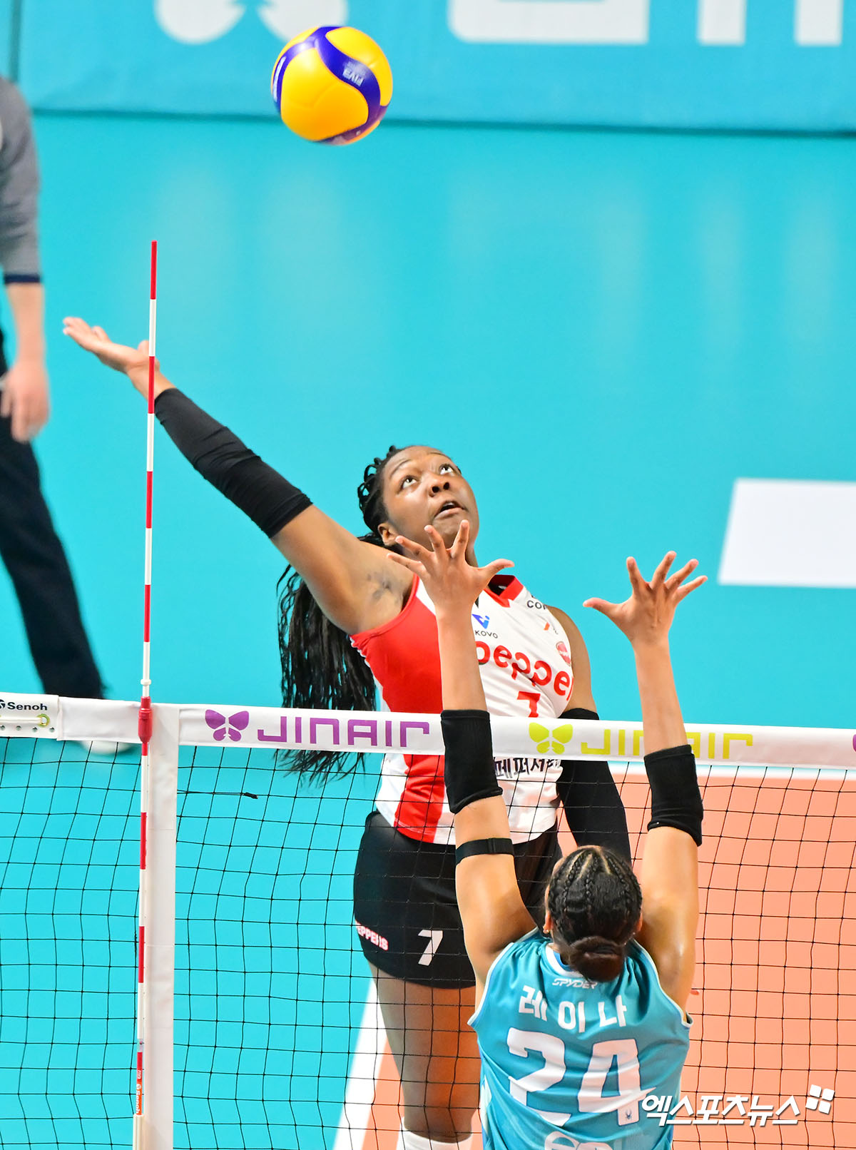 (엑스포츠뉴스 장충, 김한준 기자) 11일 오후 서울 장충체육관에서 열린 '진에어 2025-2026 V-리그' GS칼텍스와 페퍼저축은행의 경기, 페퍼저축은행 조이가 공격을 시도하고 있다.