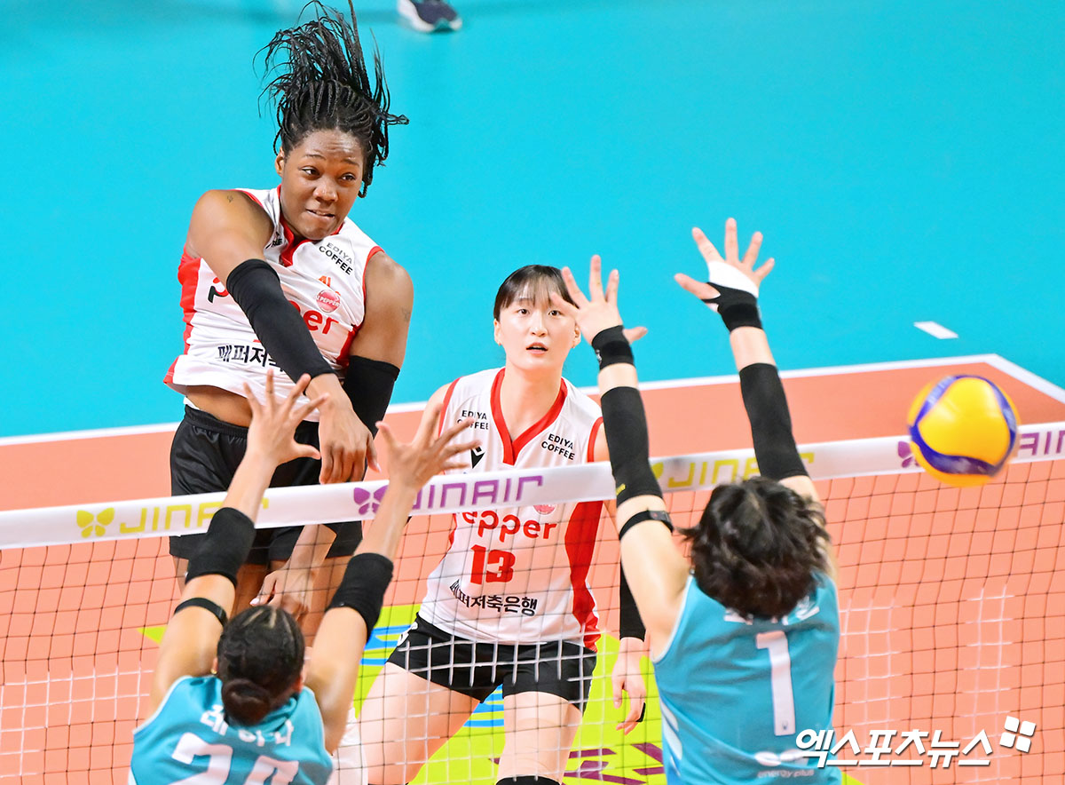 (엑스포츠뉴스 장충, 김한준 기자) 11일 오후 서울 장충체육관에서 열린 '진에어 2025-2026 V-리그' GS칼텍스와 페퍼저축은행의 경기, 페퍼저축은행 조이가 공격을 시도하고 있다.