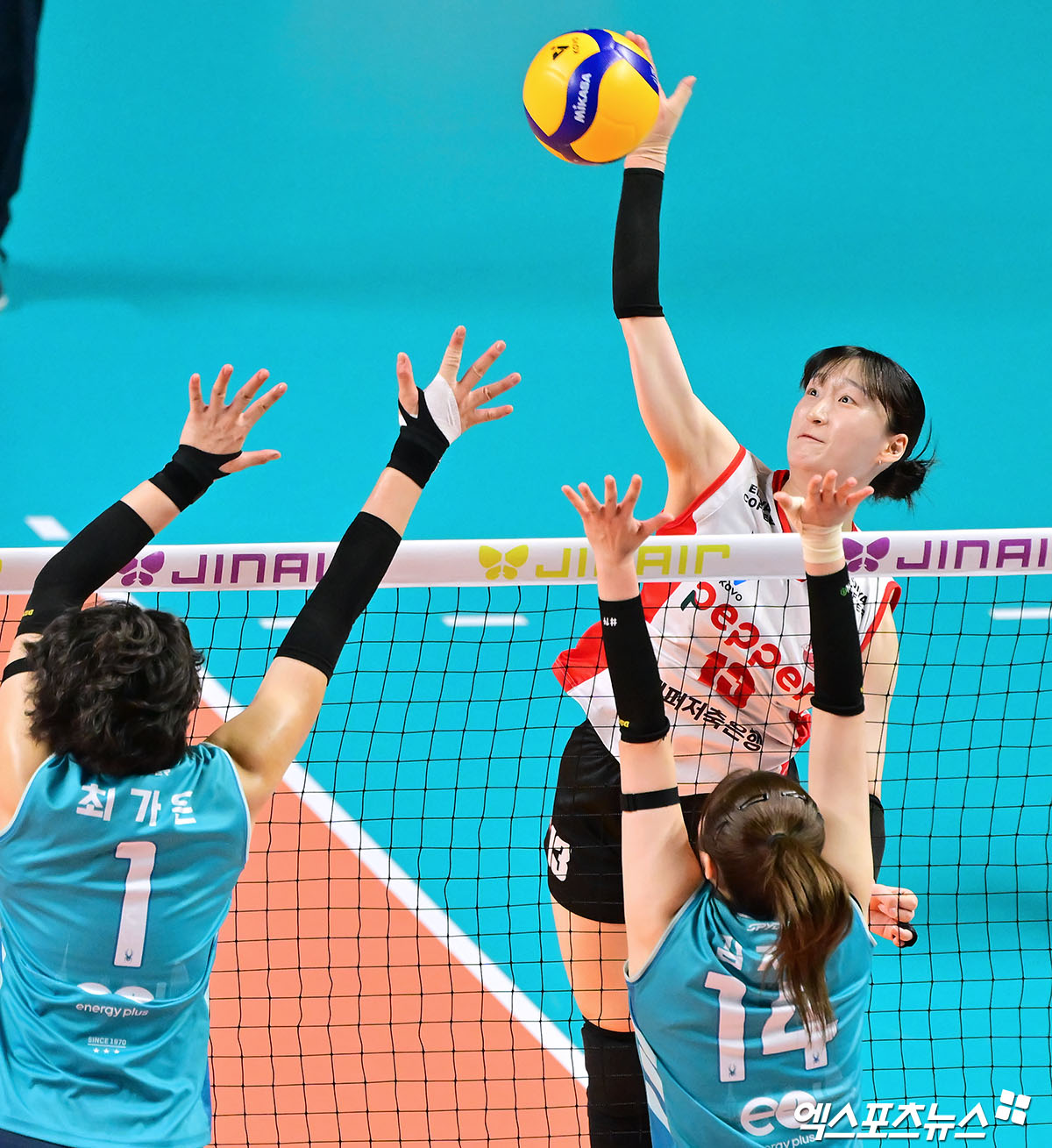 (엑스포츠뉴스 장충, 김한준 기자) 11일 오후 서울 장충체육관에서 열린 '진에어 2025-2026 V-리그' GS칼텍스와 페퍼저축은행의 경기, 페퍼저축은행 박은서가 공격을 시도하고 있다.