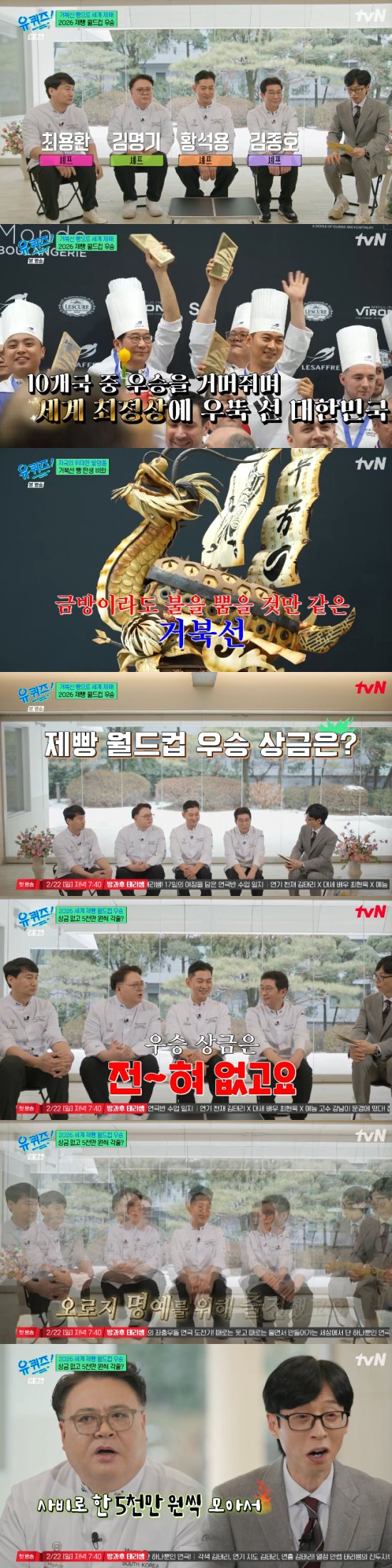11일 방송된 tvN 예능 프로그램 '유 퀴즈 온 더 블럭'에서는 '거북선 빵'으로 세계를 제패한 '2026 베이커리 월드컵' 우승팀 김종호, 황석용, 김명기, 최용환 셰프가 출연해 이야기를 나눴다.