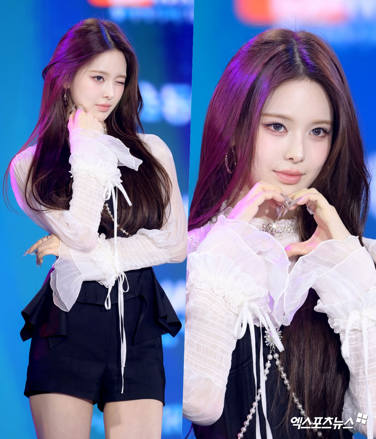 군더더기 없는 피지컬 밸런스는 단연 압권. 작은 얼굴과 길게 뻗은 팔다리, 안정적인 체형의 비율이 어우러지며 ‘화면을 찢고 나온 실물’이라는 말이 절로 나왔다. 카메라를 향해 만든 하트 포즈는 도회적인 분위기 속에서도 사랑스러운 매력을 더했다.