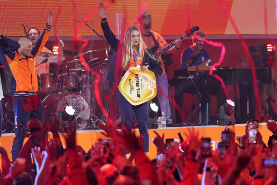 우승 기념 행사장으로 보이는 곳의 단상에 들어선 레이르담은 금메달과 함께 관중을 향해 인사를 하고, 메달을 입에 물거나 들어 보이는 등 다양한 포즈를 선보였다.