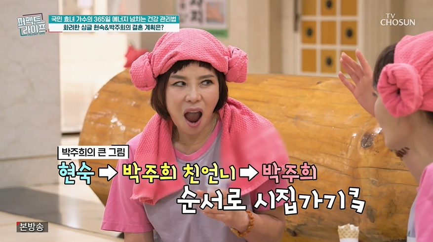 이어진 VCR 영상에서 현숙은 절친한 후배 가수 박주희와 함께 찜질방을 찾았다. 간식을 먹으며 이야기를 하던 중 결혼과 관련한 이야기가 나왔고, 박주희는 "우리 언니 아직 시집 못 갔다. 언니(현숙)가 가고 우리 언니가 가고 제가 가야죠"라고 말했다.