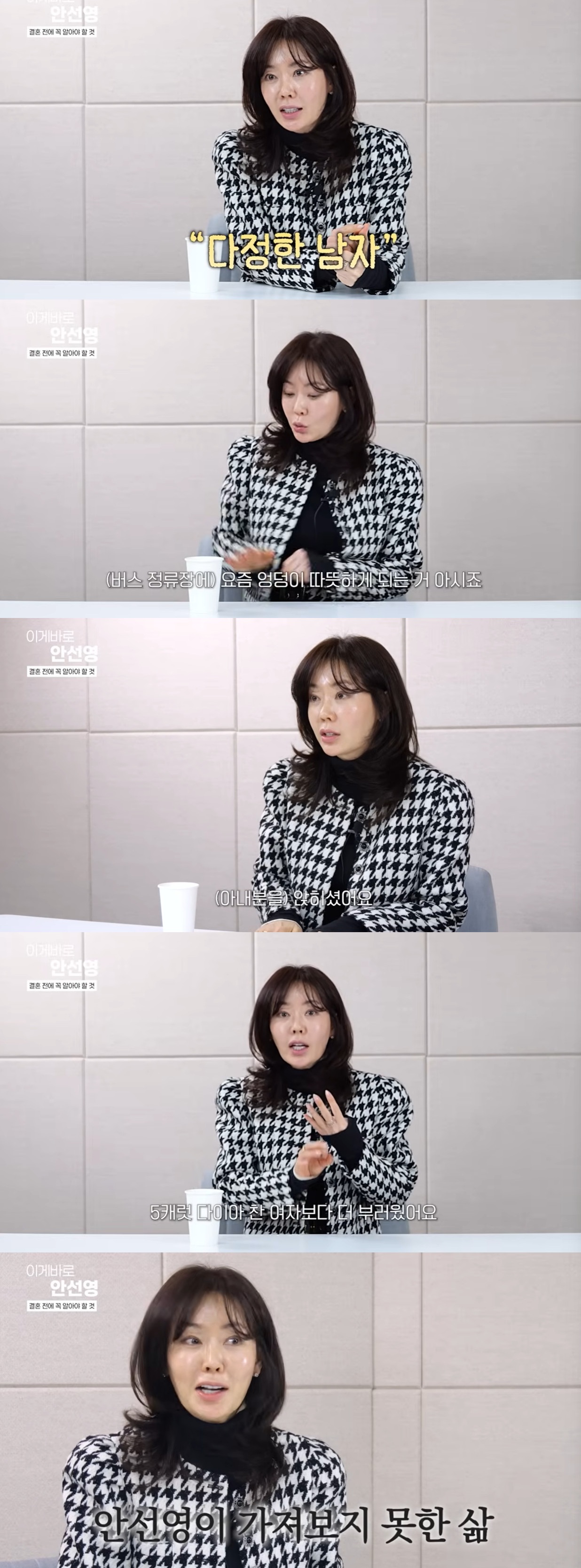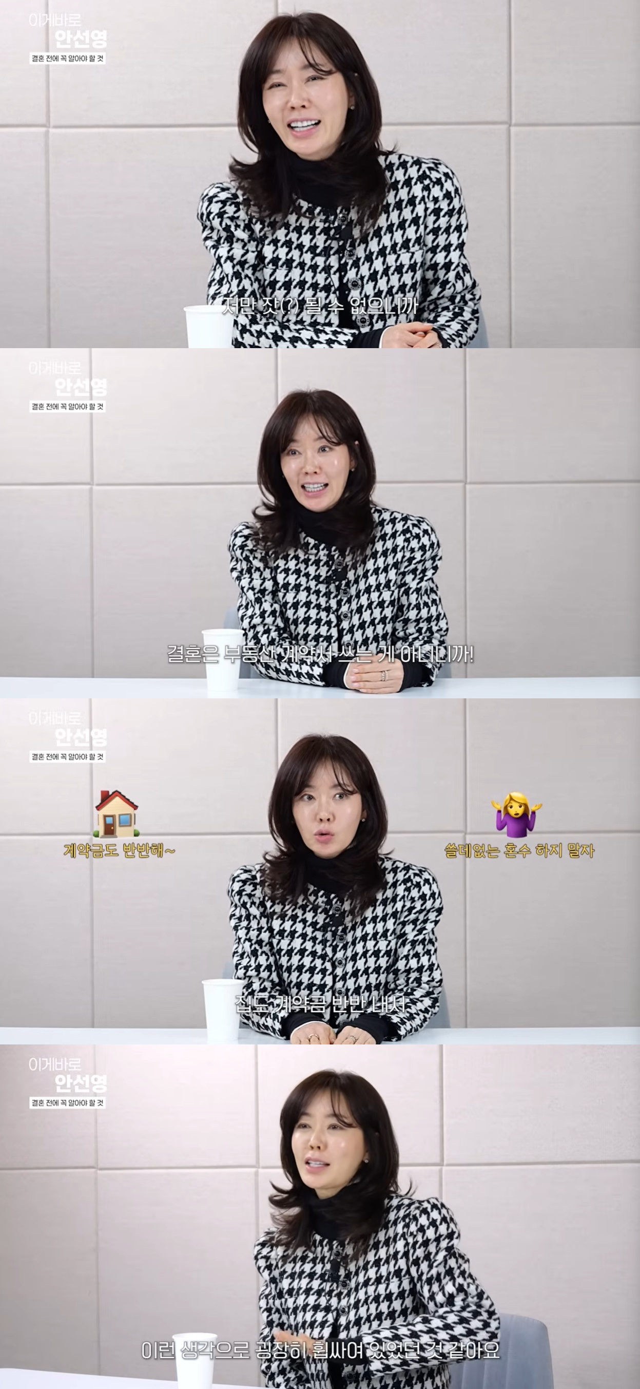 안선영은 "전 공평해야 한다며 혼수도 하지 말고 현명하게 집 계약금도 반반해서 갚아 나가자는 생각이었다. 하지만 손해보지 않아야한다는 마음으로 결혼할 거면 하지 마라"라고 자신의 이야기를 꺼냈다.