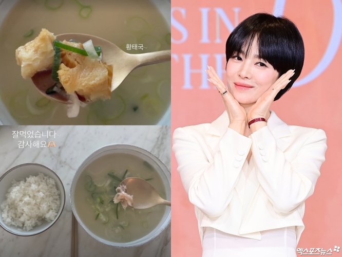 12일 송혜교는 개인 채널에 "황태국~ 잘 먹었습니다. 감사해요"라는 글과 함께 두 장의 사진을 업로드했다.