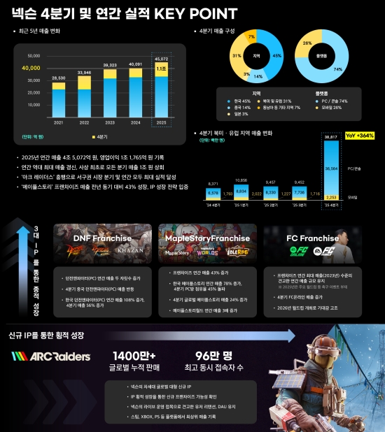 넥슨은 'IP 성장 전략'을 바탕으로 연간 역대 최대 매출을 달성했다. 4분기 신작 '아크 레이더스(ARC Raiders)' 흥행과 '메이플스토리' 프랜차이즈의 글로벌 확장이 주효했다.
