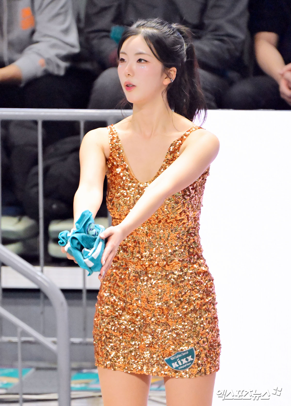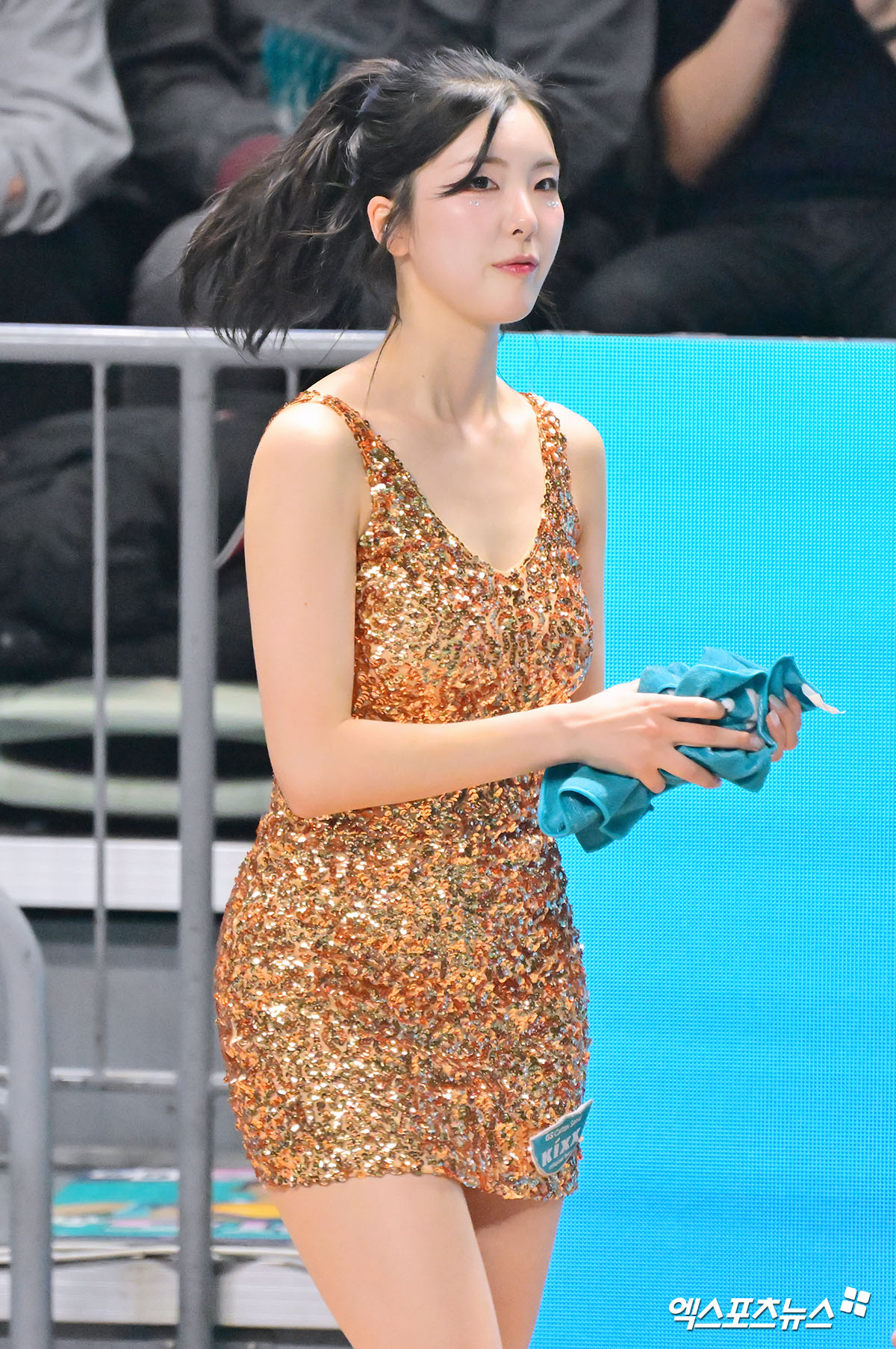 이날 김인영은 반짝이는 금빛 미니드레스를 착용하고 코트 가장자리에서 응원을 펼쳤다. 탄탄한 몸매와 밝은 미소, 역동적인 퍼포먼스가 어우러지며 현장 시선을 집중시켰다. 손에 팀 타월을 쥔 채 동작 하나하나에 힘을 실어 경기장 분위기를 끌어올렸다.
