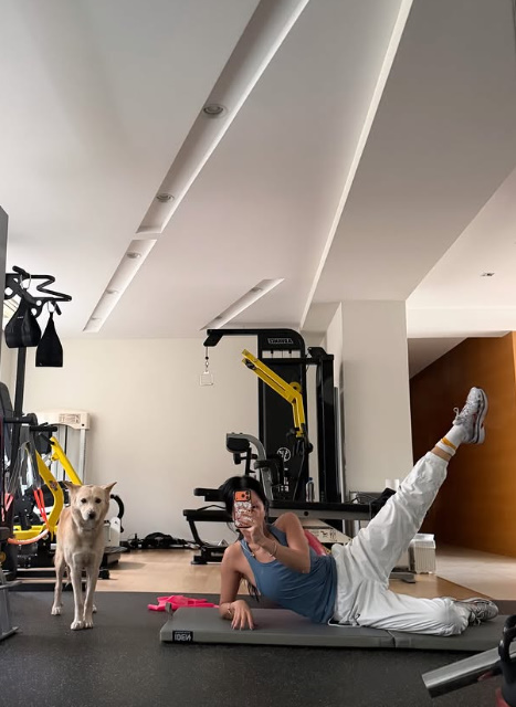 편안한 트레이닝복 차림에도 군살 없는 실루엣과 곧게 뻗은 다리 라인이 눈길을 끈다. 특히 옆으로 누운 채 다리를 높이 들어 올리는 고난도 동작을 안정적으로 해내며 탄탄한 코어 힘을 드러냈다.
