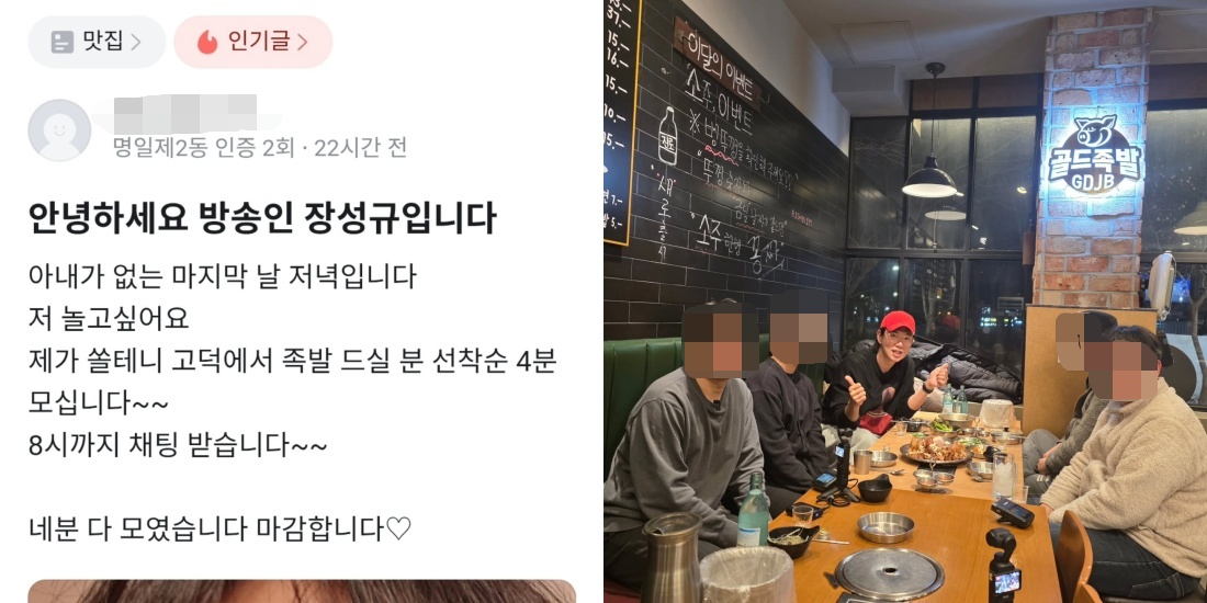 이와 함께 공개된 사진에는 장성규가 지역 기반 커뮤니티 서비스를 통해 "아내가 없는 마지막 날 저녁입니다. 저 놀고 싶어요. 제가 쏠 테니 고덕에서 족발 드실 분 선착순 4분 모십니다"라는 내용의 글을 올린 것이 담겼다.