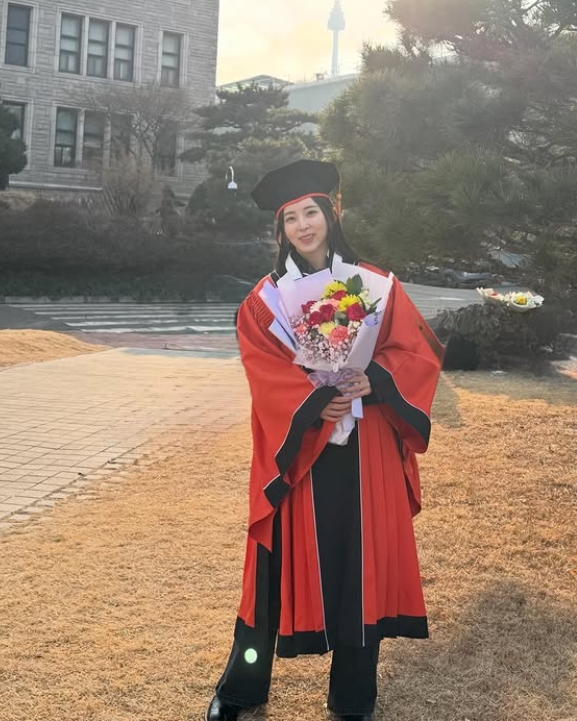 공개된 사진 속 권소현은 주황색, 검은색으로 된 학사모와 가운을 입은 채 꽃다발을 들고 포즈를 취하고 있어 눈길을 끈다.