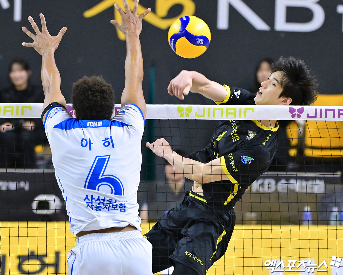 (엑스포츠뉴스 의정부, 김한준 기자) 13일 오후 경기도 의정부 경민대체육관에서 열린 '진에어 2025-2026 V-리그' KB손해보험과 삼성화재의 경기, KB손해보험 임성진이 공격을 시도하고 있다.