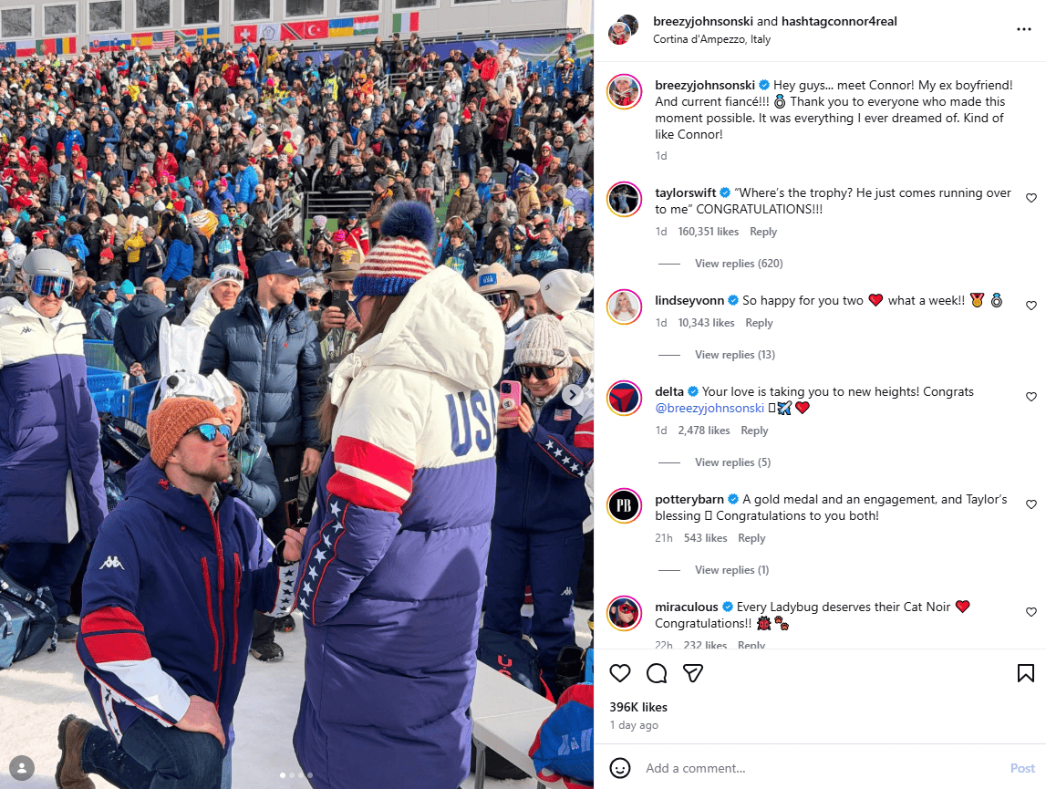 현지 매체는 “올림픽 결승선에서 공개 청혼이 이뤄졌고, 그 안에 팝스타 테일러 스위프트와 연결되는 '상징'이 담겼다"고 했다.