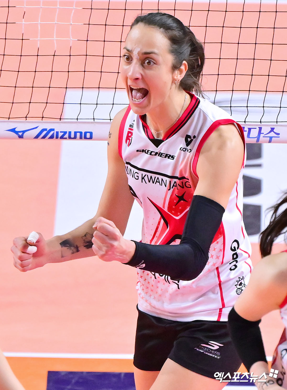 (엑스포츠뉴스 인천, 김한준 기자) 14일 오후 인천 부평구 삼산월드체육관 열린 '진에어 2025-2026 V-리그' 흥국생명과 정관장의 경기, 정관장 제네테가 득점 후 기뻐하고 있다.