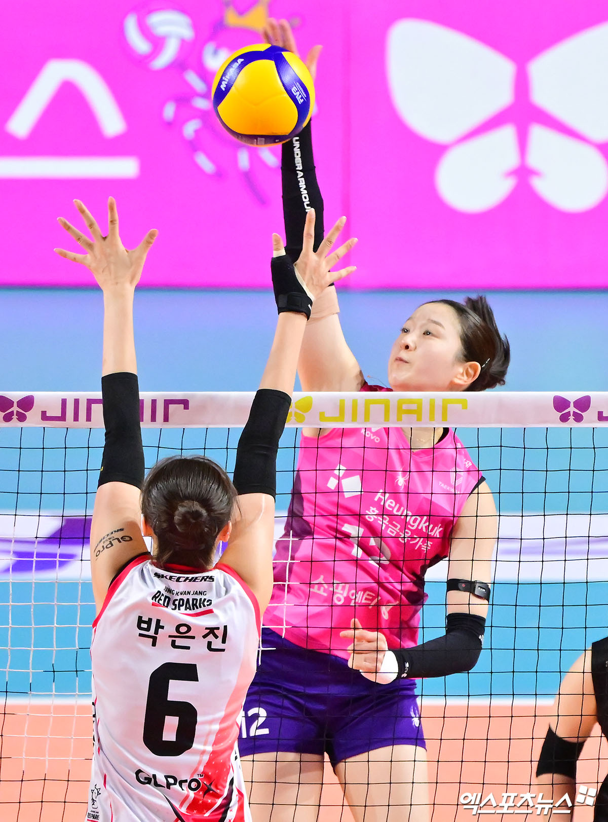 (엑스포츠뉴스 인천, 김한준 기자) 14일 오후 인천 부평구 삼산월드체육관 열린 '진에어 2025-2026 V-리그' 흥국생명과 정관장의 경기, 흥국생명 이다현이 공격을 시도하고 있다.