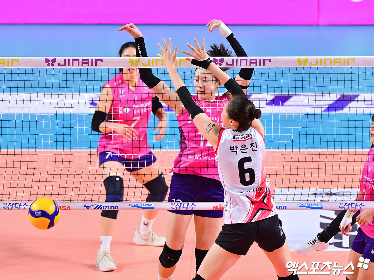 (엑스포츠뉴스 인천, 김한준 기자) 14일 오후 인천 부평구 삼산월드체육관 열린 '진에어 2025-2026 V-리그' 흥국생명과 정관장의 경기, 흥국생명 이다현이 공격을 시도하고 있다.