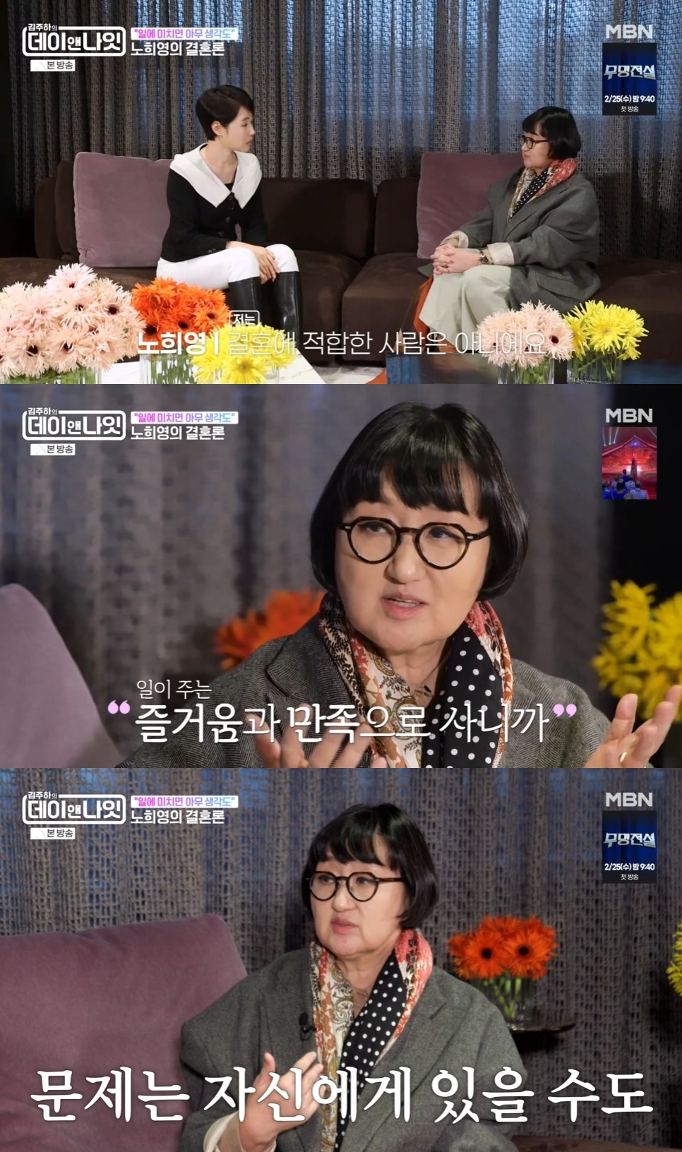 노희영은 "(전 남편이 아니라) 내가 문제였다. 저는 결혼에 적합한 사람이 아니었다. 나는 일을 하거나 출장을 가거나, 일에 미치면 아무 생각이 안 나는 사람이다. 일이 주는 즐거움과 만족으로 사니까"라고 반성했다.