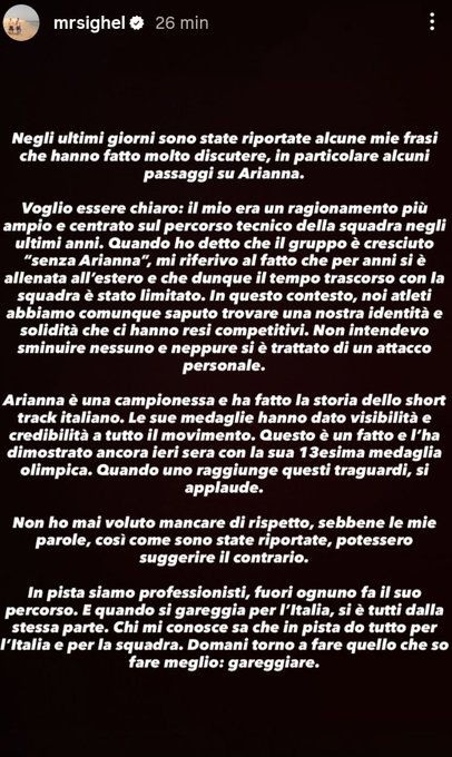 그는 개인 공격 의도는 전혀 없었다고 거듭 강조했다. 시겔은 "누구를 깎아내리려는 의도도, 개인적인 공격도 아니었다"며 "아리안나는 챔피언이며 이탈리아 쇼트트랙 역사를 만든 선수다. 그녀의 메달은 종목 전체에 가시성과 신뢰를 줬다"고 평가했다.