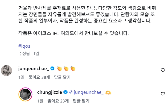 이에 연인 정은채는 해당 게시글에 박수 모양 이모티콘을 남기며 공개적으로 응원을 보냈다. 김충재 역시 하트 모양 이모티콘으로 화답하며 달달한 분위기를 자아냈다.