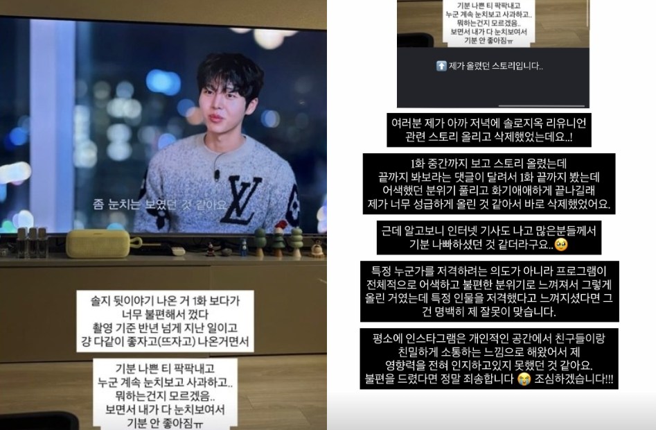 이와 관련 찰스엔터는 "1화 중간까지 보고 스토리 올렸는데 끝까지 봐보라는 댓글이 달려서 1화 끝까지 봤는데, 어색했던 분위기 풀리고 화기애애하게 끝나길래 제가 너무 성급하게 올린 것 같아서 바로 삭제했다"고 설명했다.