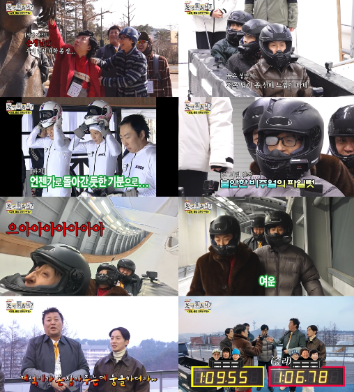 이어 유재석이 야심 차게 준비한 ‘선택 관광’ 겨울 액티비티의 정체가 밝혀졌다. 바로 스펀지 썰매로 즐길 수 있는 봅슬레이 체험이었다. 체험 비용이 5만 9000원이었고, 9000원 잔돈은 3:3 팀을 나눠 기록 대결을 해서 내기로 했다. 봅슬레이 초심자 하하-허경환-주우재 ‘동생’ 팀은 아찔한 스피드에 눈물을 흘렸고, 하하는 다리에 힘이 풀린 모습을 보였다.