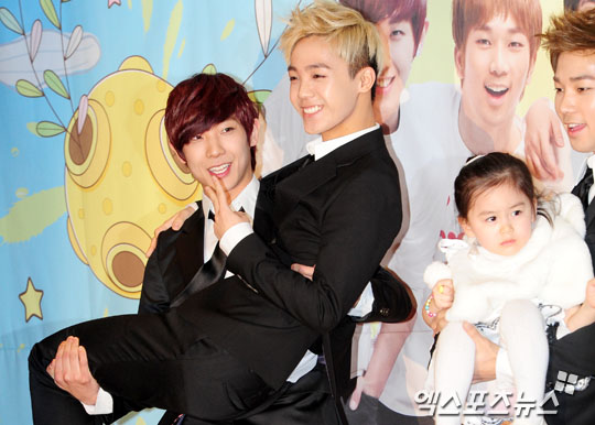 [엑스포츠뉴스 = 권태완 기자] 16일 오후 서울 역삼동 강남 노보텔 호텔에서 열린 KBS JOY '엠블랙의 헬로 베이비' 제작발표회에서 엠블랙 지오, 승호, 천둥이 아이들을 안고 포즈를 취하자 이준이 미르를 안고 포즈를 취해 좌중에 웃음이 터졌다.