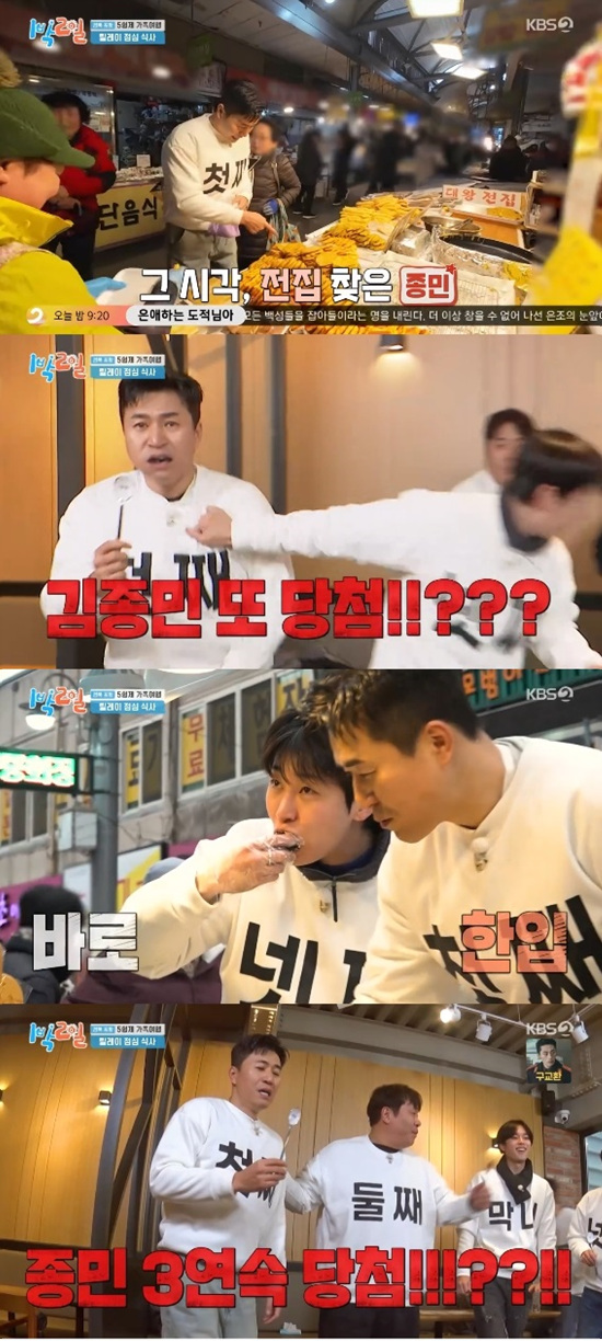 두 번째 주자로는 김종민과 딘딘이 당첨됐다. 이미 식사를 하고 온 김종민은 2연속 당첨에 당황하며 다시 나갔다.