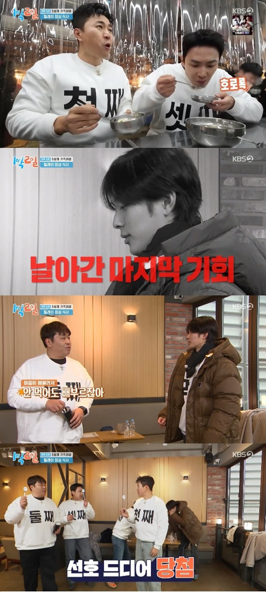 그때 이준과 딘딘이 유선호를 위해 아무 것도 먹지 않고 돌아왔다. 유선호는 50초가 남은 상황에서 드디어 당첨되며 꽈배기를 비롯한 각종 빵으로 식사를 해결했다.