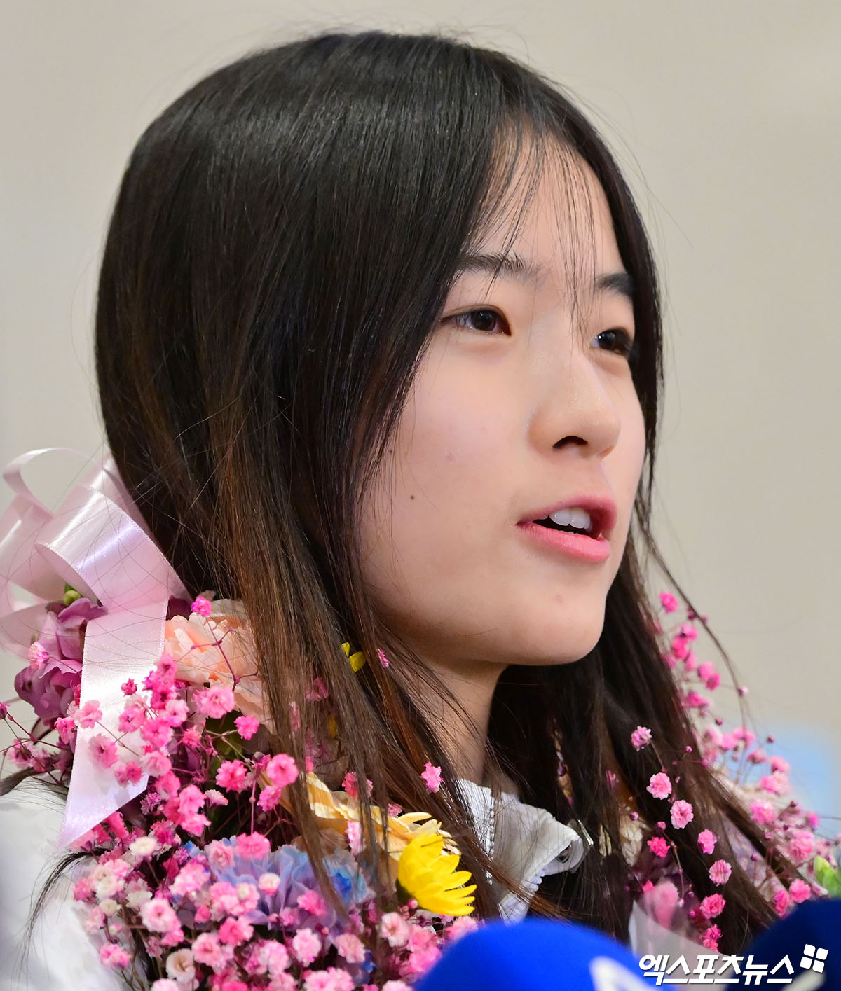 최가온이 취재진의 질문에 답하고 있다.