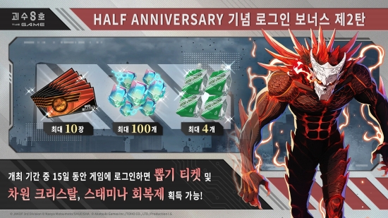 '괴수 8호 THE GAME', 0.5주년 기념 로그인 보너스 2탄 진행…'★5 확정 뽑기까지