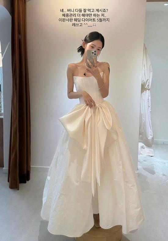 17일 최준희는 "체중관리 더 해야만 하는 저, 이판사판 웨딩 다이어트 5월까지 레쓰고"라는 글과 함께 웨딩 드레스를 입고 카메라를 바라보며 미소짓고 있는 모습이 담긴 사진을 공개했다.