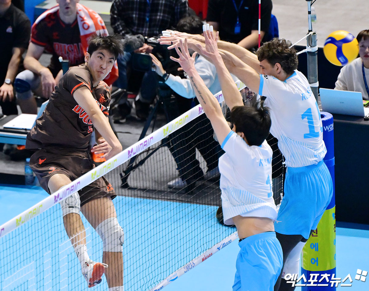 (엑스포츠뉴스 인천, 김한준 기자) 18일 오후 인천 계양체육관에서 열린 '진에어 2025-2026 V-리그' 대한항공과 OK저축은행의 경기, OK저축은행 차지환이 공격을 시도하고 있다.