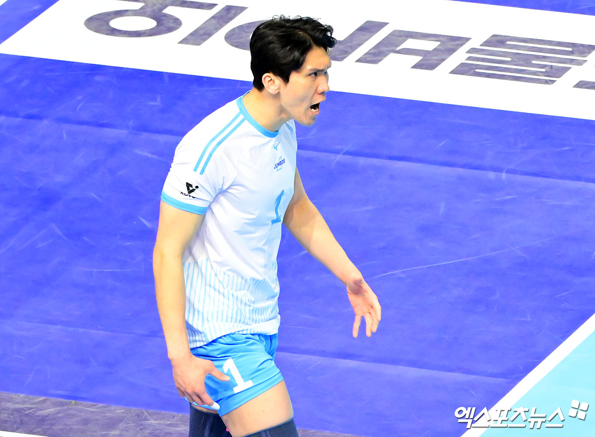 (엑스포츠뉴스 인천, 김한준 기자) 18일 오후 인천 계양체육관에서 열린 '진에어 2025-2026 V-리그' 대한항공과 OK저축은행의 경기, 대한항공 김규민이 블로킹 성공 후 기뻐하고 있다.