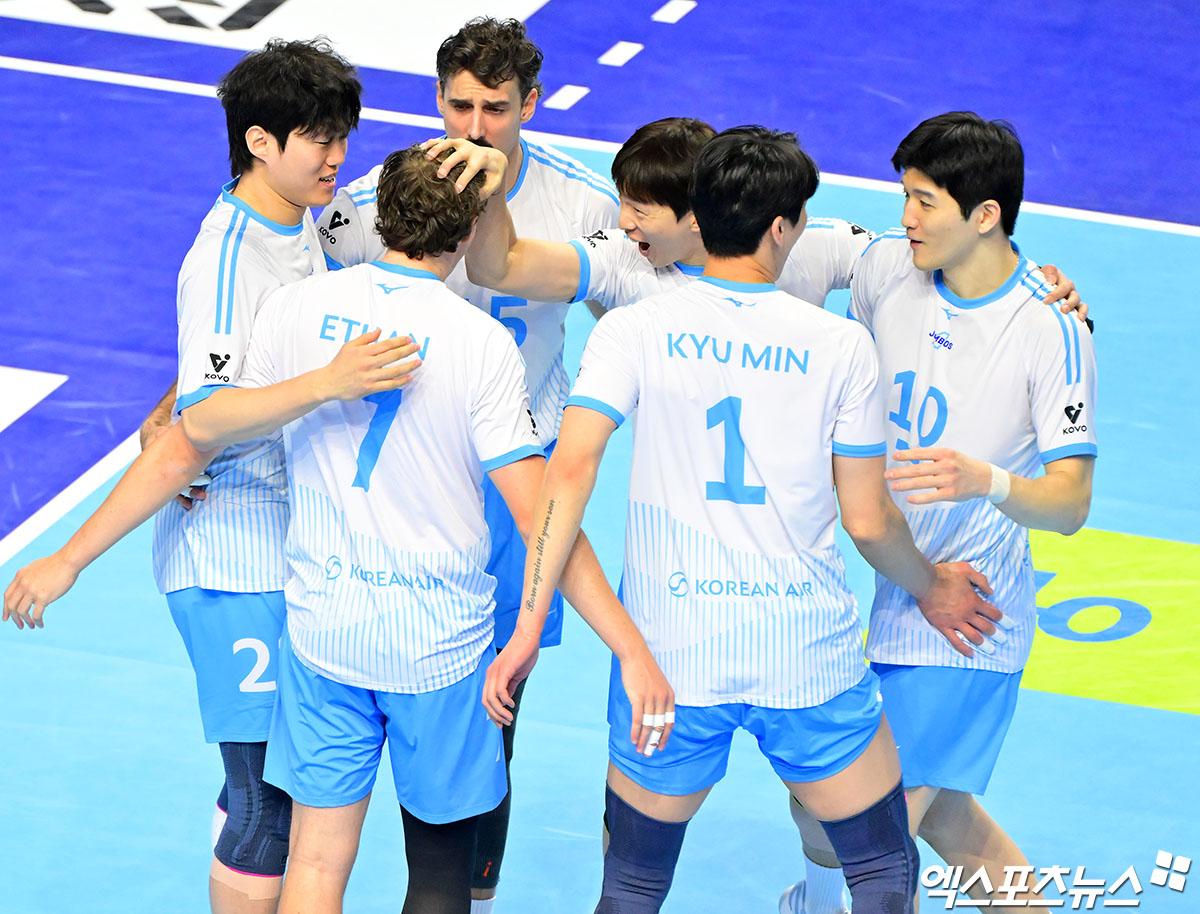 (엑스포츠뉴스 인천, 김한준 기자) 18일 오후 인천 계양체육관에서 열린 '진에어 2025-2026 V-리그' 대한항공과 OK저축은행의 경기, 대한항공 선수들이 기뻐하고 있다.