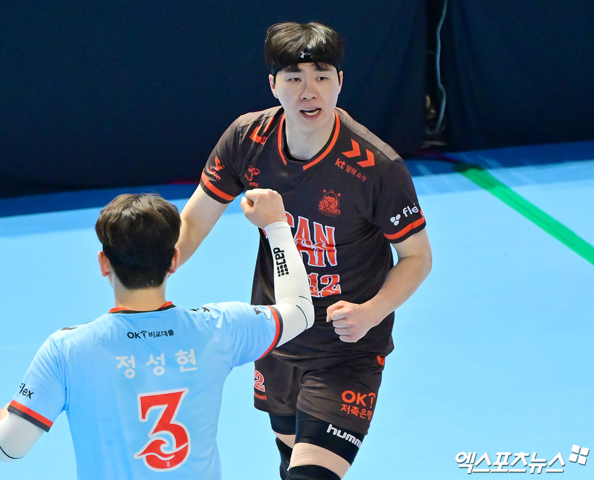 (엑스포츠뉴스 인천, 김한준 기자) 18일 오후 인천 계양체육관에서 열린 '진에어 2025-2026 V-리그' 대한항공과 OK저축은행의 경기, OK저축은행 전광인이 기뻐하고 있다.