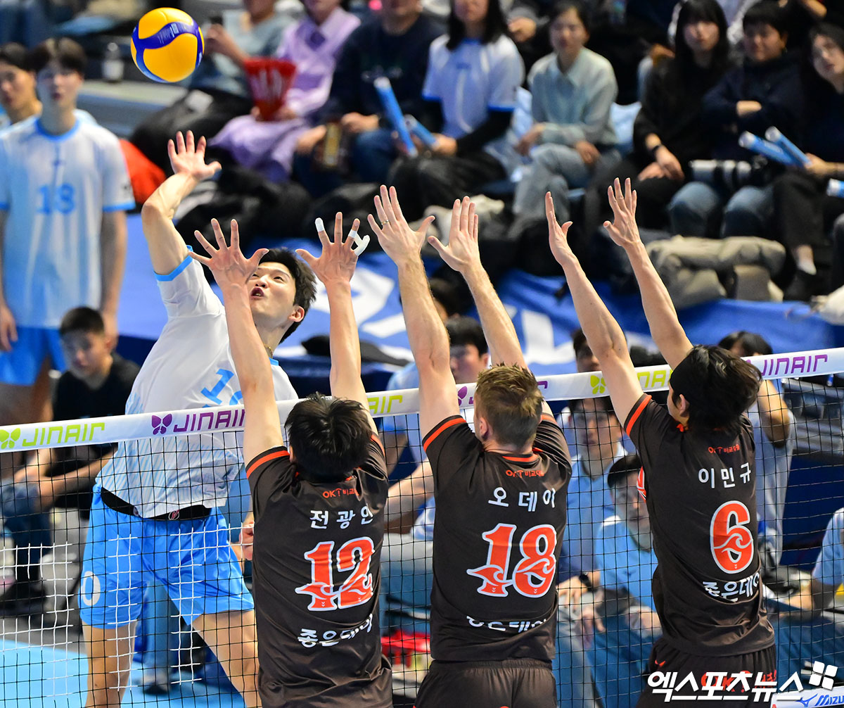 (엑스포츠뉴스 인천, 김한준 기자) 18일 오후 인천 계양체육관에서 열린 '진에어 2025-2026 V-리그' 대한항공과 OK저축은행의 경기, 대한항공 정지석이 공격을 시도하고 있다.