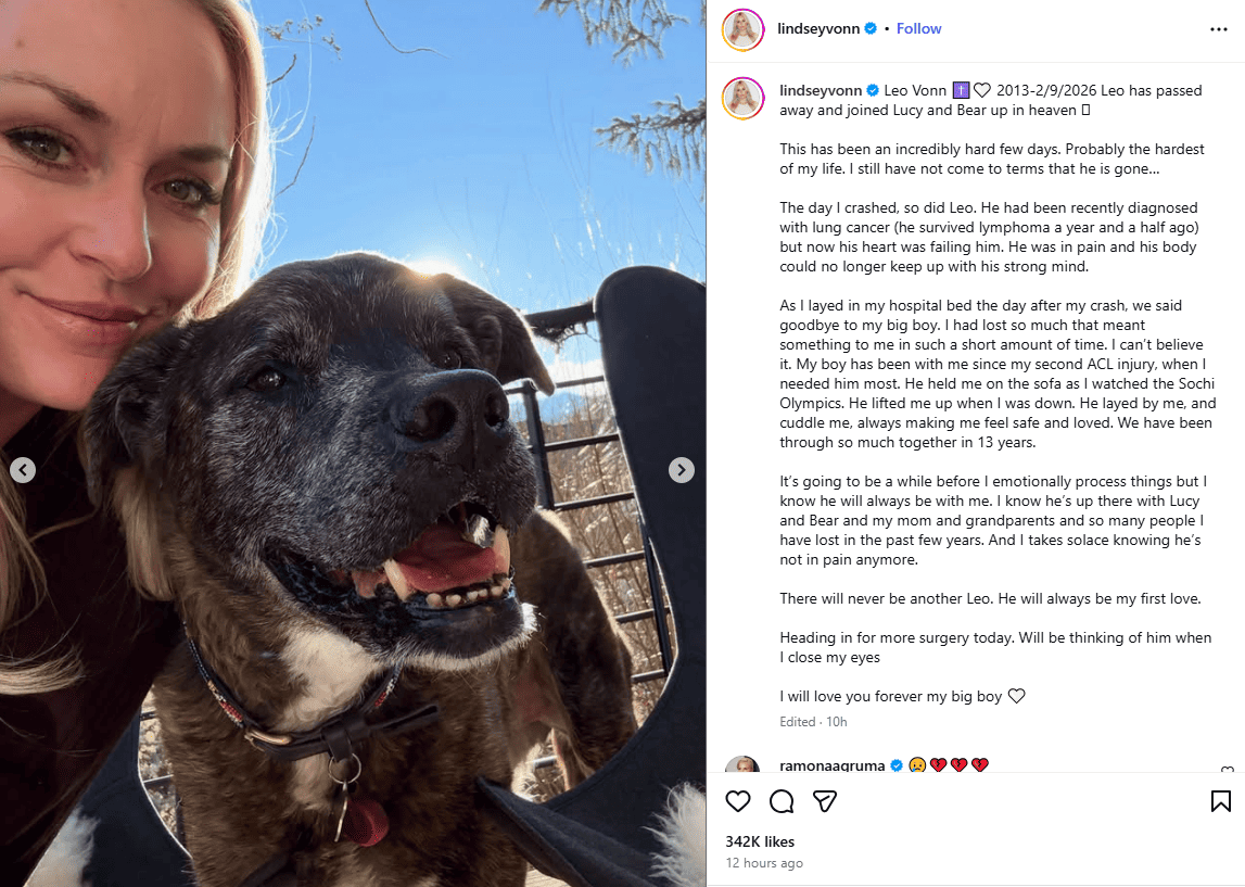 (엑스포츠뉴스 이우진 기자) 설원 위에서의 충격적인 추락, 그리고 그 직후 찾아온 또 하나의 이별. 미국 알파인 스키의 '리빙 레전드' 린지 본(41)이 2026 밀라노·코르티나담페초 동계올림픽 도중 큰 부상을 당한 데 이어 13년을 함께한 반려견 리오를 떠나보낸 사실을 털어놓으며 깊은 슬픔을 전했다.