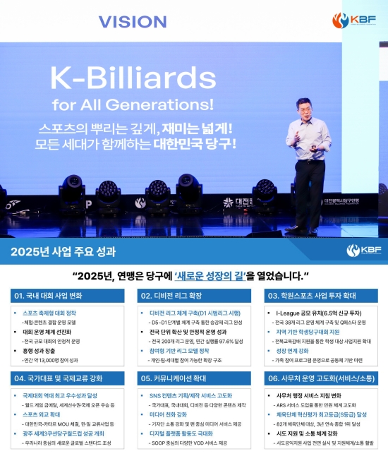 연맹은 향후 K-Billiards 통합 브랜드 아래 당구를 문화·콘텐츠·글로벌 스포츠 브랜드로 확장할 계획이다.